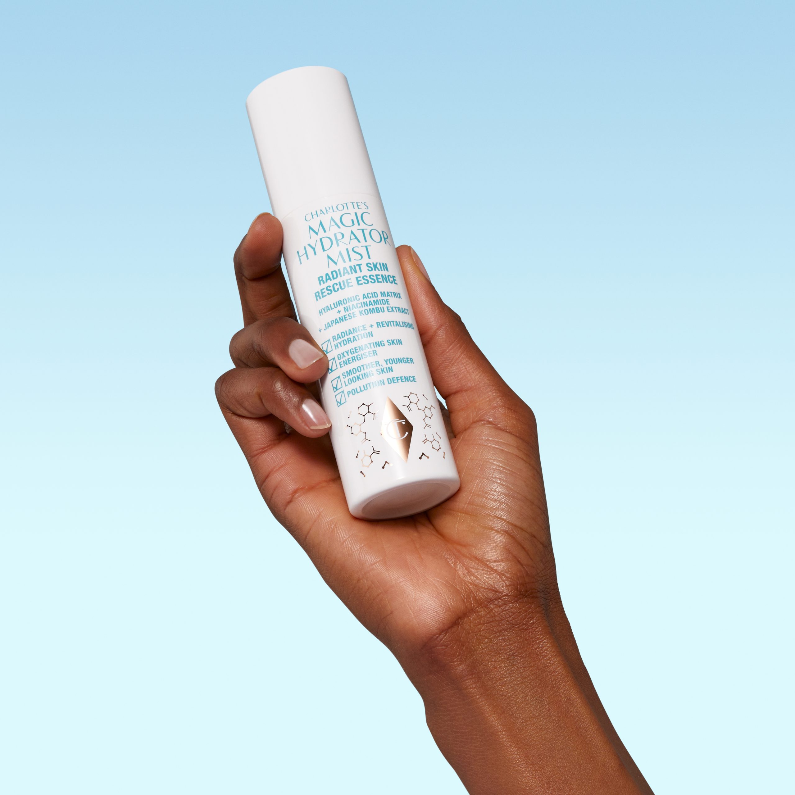 Charlotte’s Magic Hydrator Mist (75ml): An oxygenating, hydrating face mist for an instant dewy glow on-the-go! Powered by HYALURONIC MESH TECHNOLOGY to help shield the skin from daily pollution, plus NEW! Kombu Extract, which visibly reduces signs of digital fatigue, this is an unmissable step in your IMMEDIATE SKIN REVIVAL routine! Inspired by the power of an OXYGEN FACIAL, it’s a RADIANT SKIN ESSENCE for smoother, younger looking skin! Use on cleansed skin every morning and evening, before Glow Toner, Charlotte’s Magic Serum Crystal Elixir and your magic moisturizer!